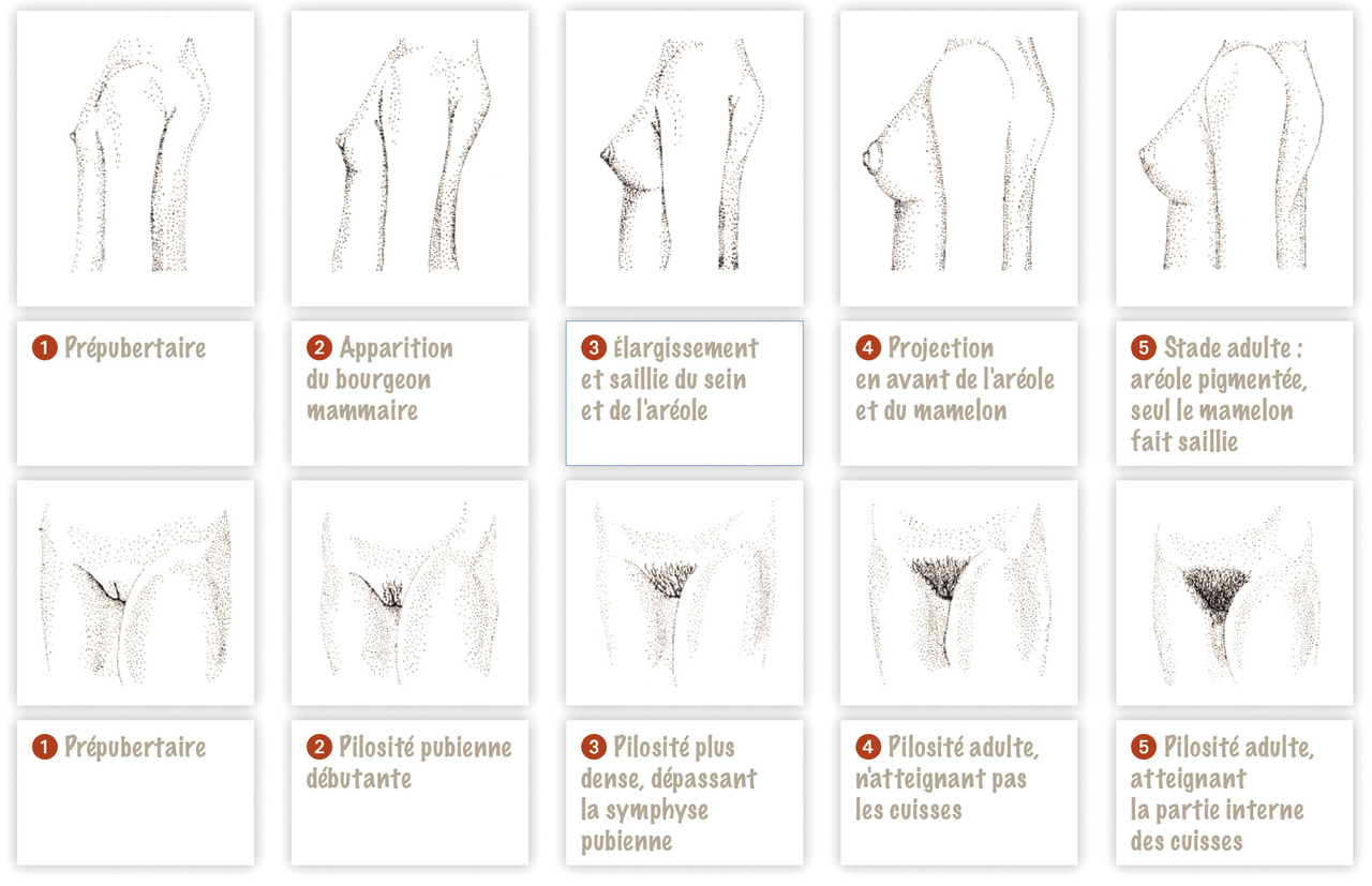 Les premières manifestations de la puberté sont le développement des seins chez la fille et l’augmentation du volume testiculaire chez le garçon. L’accélération de la croissance staturale est un signe majeur de cette période.