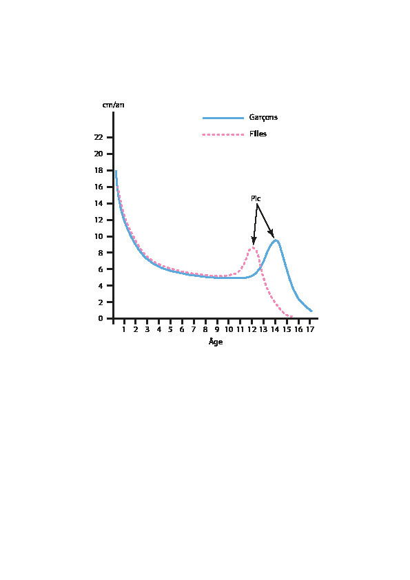 Chez les garçons, l’accélération de la croissance pubertaire est retardée d’environ un an par rapport aux premiers signes pubertaires. La croissance pubertaire totale moyenne est de 25 à 28 cm. La taille finale est atteinte autour de 18 ans et se situe en France à 178 cm en moyenne.