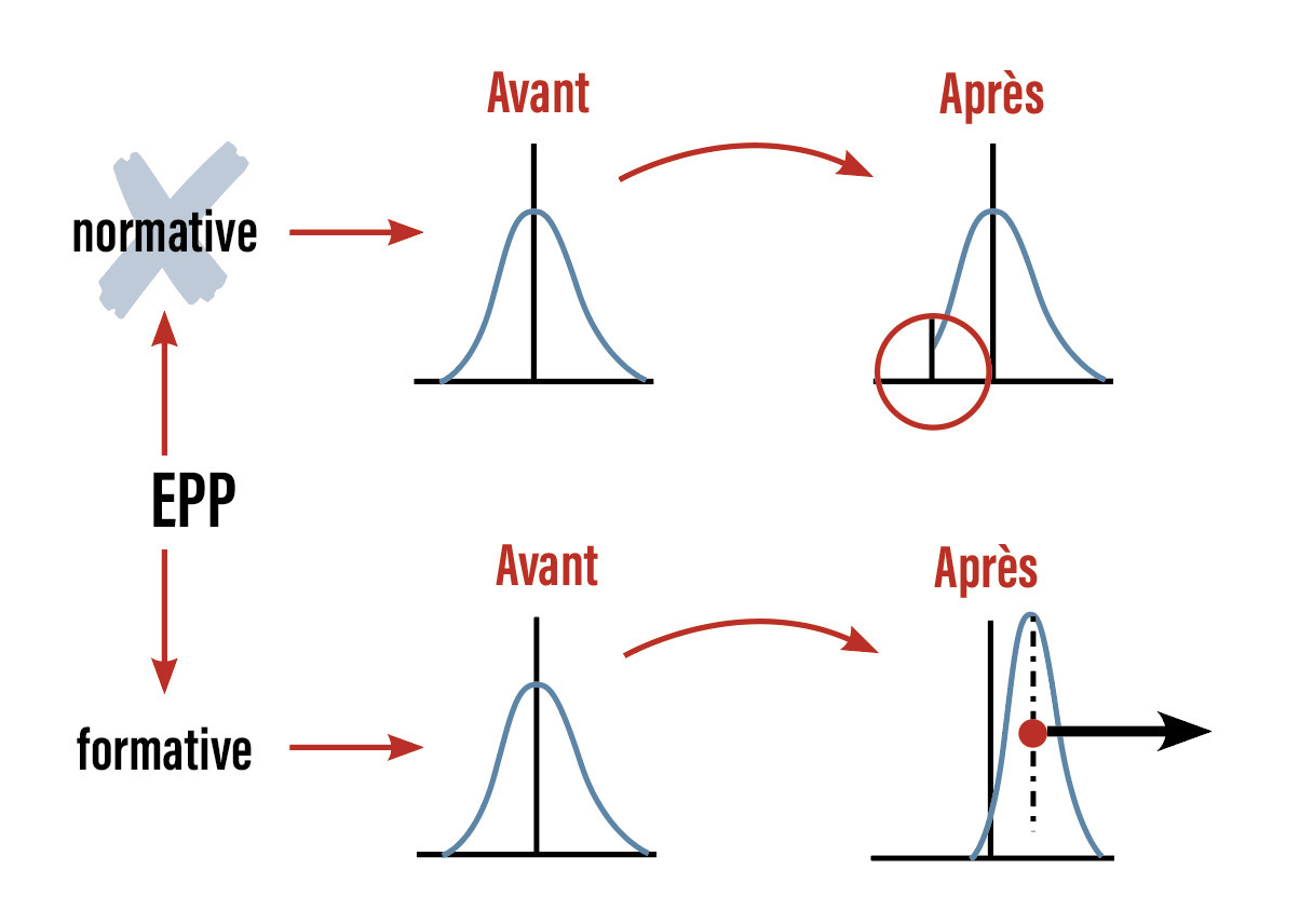 En revanche, les courbes de la partie basse peuvent montrer une évolution importante de la qualité obtenue dès lors que la démarche qualité, consistant à s’inscrire dans une démarche formative, est mise en œuvre. Cette démarche d’amélioration continue peut être résumée par quatre temps principaux qui se répètent indéfiniment : d’abord établir ce que pourrait être une démarche optimale, puis la mettre en œuvre, avant d’en analyser le déroulement et le résultat, enfin rechercher les améliorations possibles et les mettre en œuvre… indéfiniment. C’est pourquoi on peut préférer une approche « formative » à une approche « normative ».