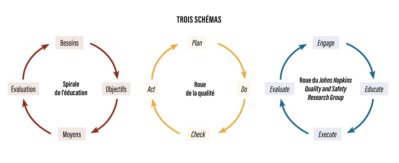 - d’autre part, l’approche managériale développée autour des travaux réalisés par les « qualiticiens ». Cette approche s’est appliquée au monde de l’entreprise industrielle, commerciale, puis de plus en plus à celui des services. Elle consiste principalement à analyser les processus, à établir des standards et à s’assurer que les productions sont, autant que possible, conformes aux procédures. Plusieurs experts américains ayant connu le succès et la notoriété au Japon – immense chantier de renaissance économique après la Seconde Guerre mondiale – entre 1950 et 1980, comme Deming, Crosby et Juran, ont été les chantres de cette approche (le « zéro défaut »), dont l’applicabilité au secteur de la santé a été longtemps contestée. William E. Deming est en particulier passé à la postérité comme l’initiateur de la « roue » qui porte son nom et qui fait se succéder indéfiniment les quatre étapes qui constituent la démarche générique de gestion de la qualité : P, D, C, A, pour Plan, Do, Check et Act, que l’on peut traduire par planifier, réaliser, vérifier et améliorer (