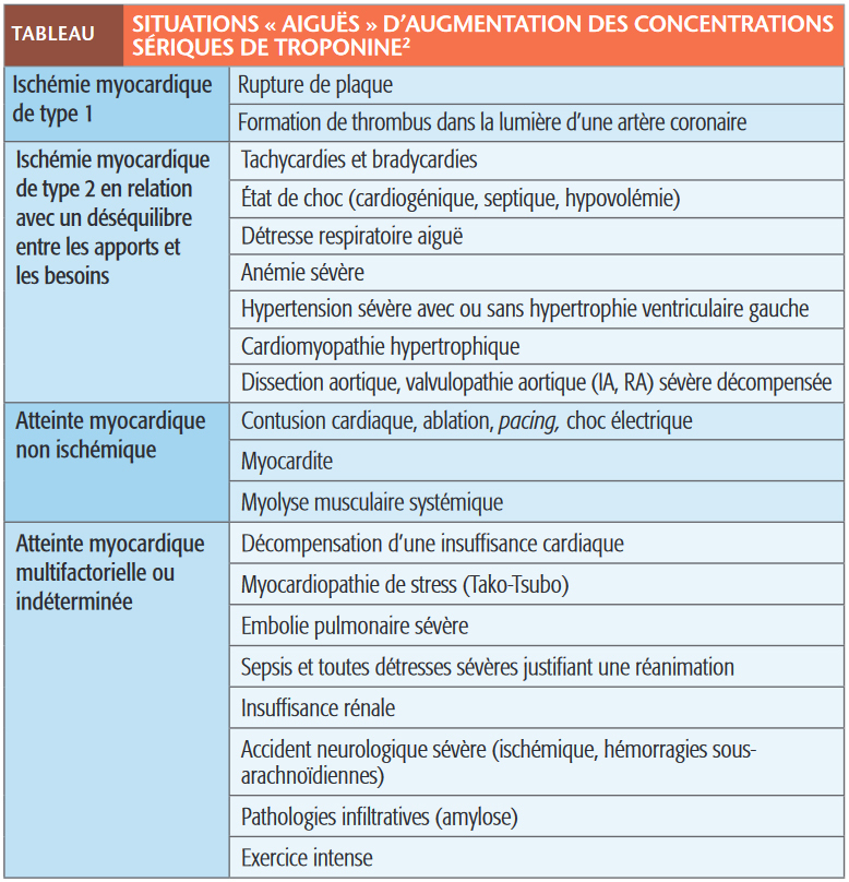 En contrepartie d’une meilleure sensibilité, la spécificité des troponines hypersensibles n’est pas optimale : leur dosage peut être élevé dans des situations sans rapport avec une pathologie coronaire (v. tableau). L’embolie pulmonaire, la myocardite aiguë, l’état de choc (septique), l’œdème aigu du poumon même non ischémique, les troubles du rythme, un traumatisme, une chirurgie voire une insuffisance rénale peuvent entraîner une élévation de la troponine. Ces situations témoignent d’une souffrance cardiomyocytaire mais non coronaire (plaque d’athérome fissurée ou infarctus).