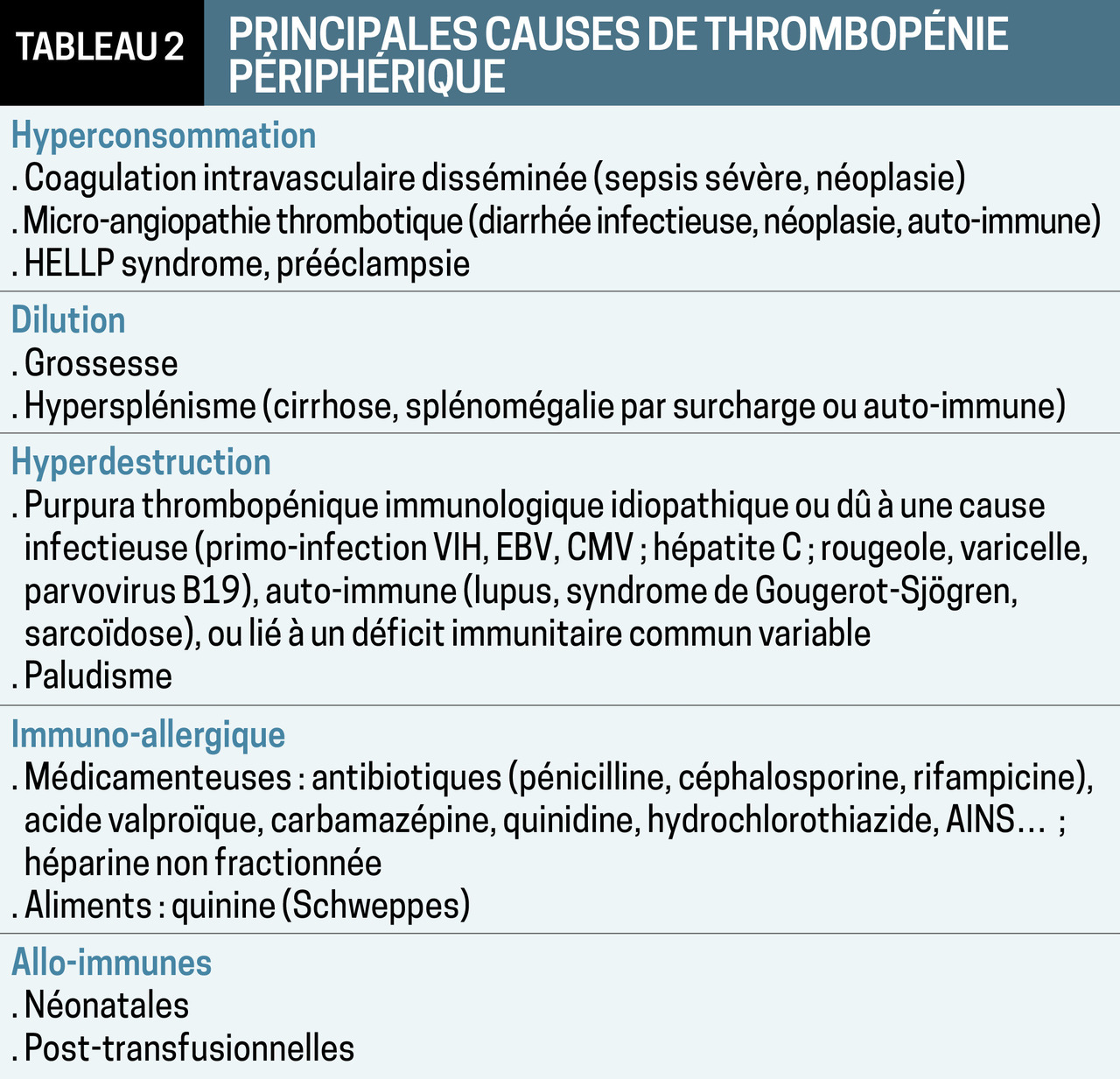 – prise médicamenteuse dans les 10 jours précédant son apparition, responsable soit d’une toxicité médullaire (chimiothérapie), soit d’une réaction immunoallergique (le médicament génère un site antigénique à la surface des plaquettes, entraînant leur destruction) ; thrombopénie induite par l’héparine, surtout non fractionnée (via la production d’anticorps antiplaquettaires) : occasionne des thromboses artérielles et veineuses ;