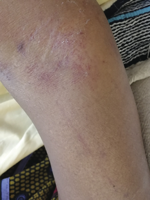 – au niveau cutané : purpura pétéchial non infiltré, vibices (fig. 1 ), ecchymoses spontanées ;