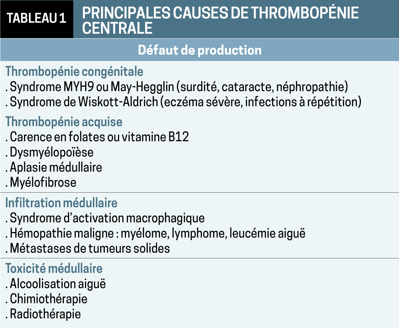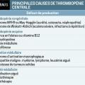 Une thrombopénie peut donc être due à une cause centrale (défaut de production ; peu ou pas de mégacaryocytes) ou périphérique (mégacaryocytes normaux) par hyperconsommation, hyper-destruction, hémodilution (hypersplénisme, grossesse).