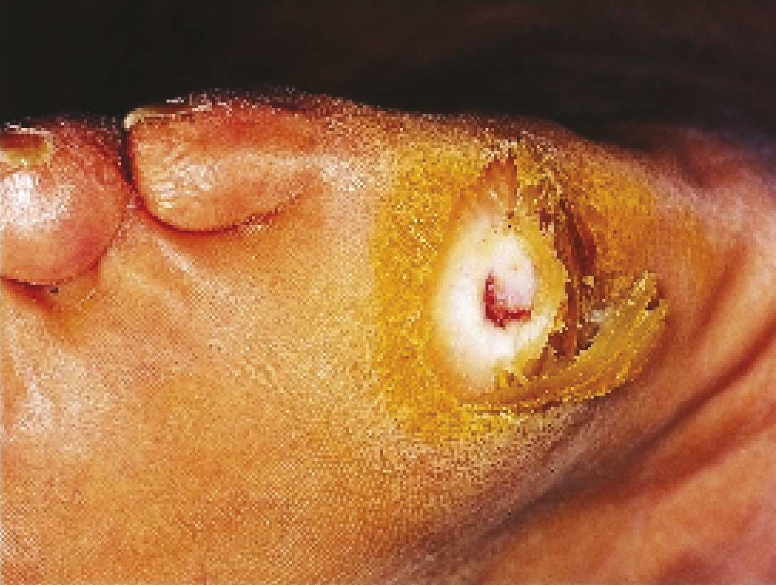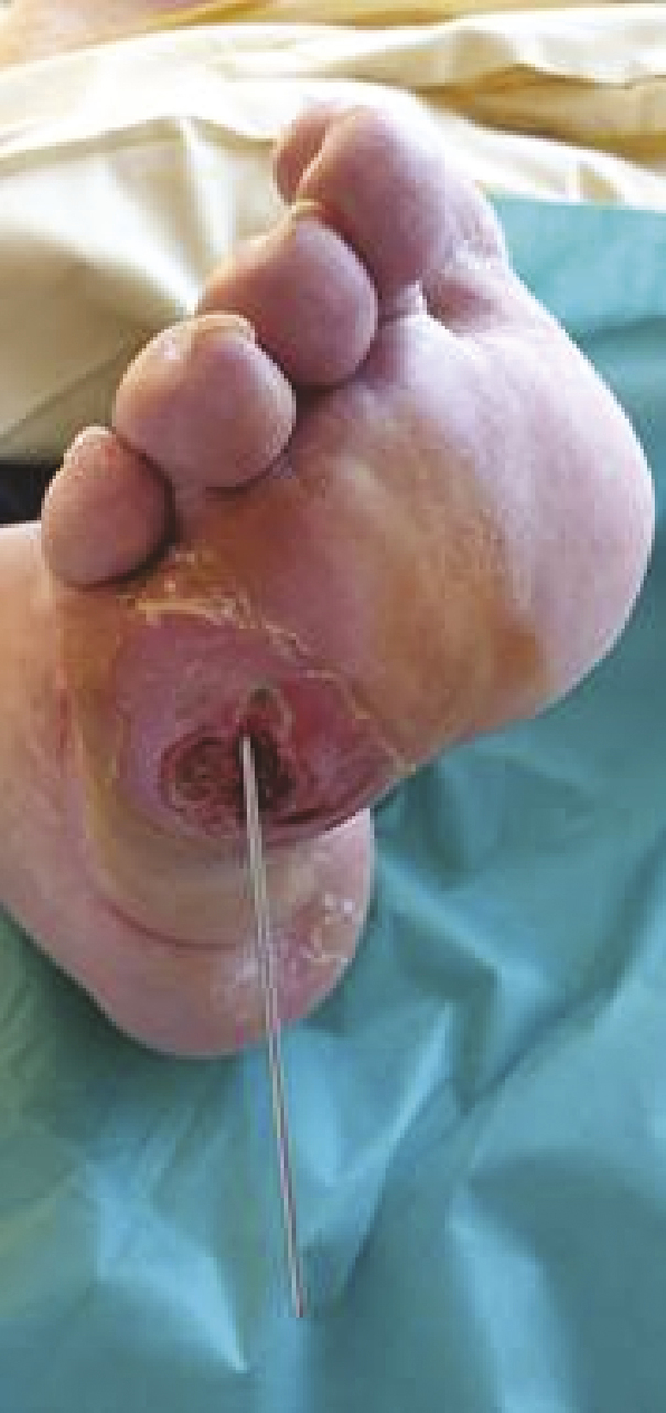 – la recherche et le traitement d’une ostéite : exploration de la plaie à l’aide d’un stylet stérile (fig. 3 ). Le traitement est chirurgical (v. p. 628 ) ou médical (6 semaines d’antibiotiques à diffusion osseuse [v. encadré p. 631 ) après une biopsie osseuse ;