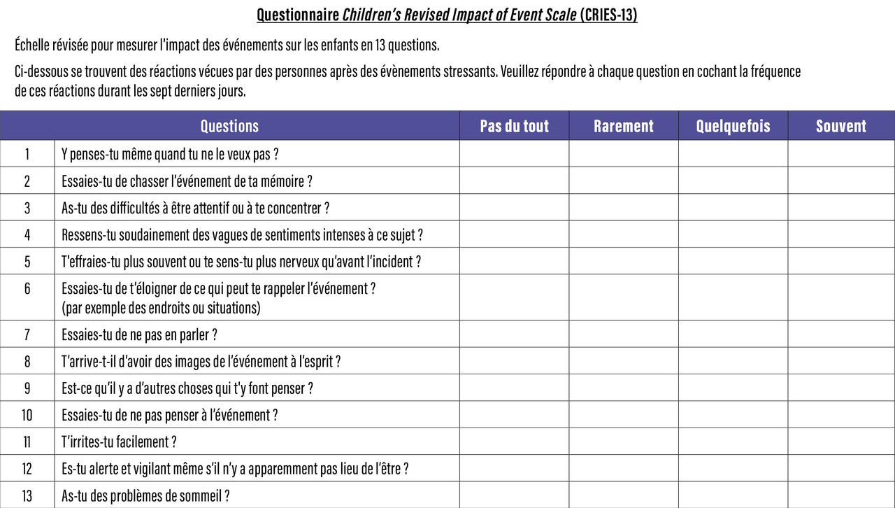 – évaluation psychomotrice2 et de l’état psychique (anxiété, dépression, questionnaires Children's Revised Impact of Event Scale-13 [CRIES-13] pour les jeunes enfants[