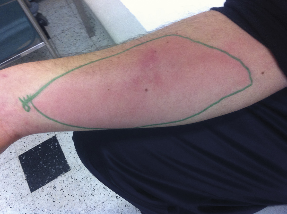 Les contours de la lésion doivent être systématiquement marqués pour en suivre l’évolution (fig. 2). Il est indispensable de rechercher une porte d’entrée locale (ici évidente). Une adénopathie inflammatoire satellite est fréquente (46 % des cas), mais l’association à une traînée de lymphangite est inconstante (26 %).