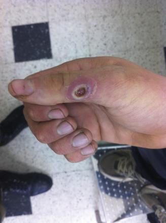 Un patient de 24 ans consulte pour l’apparition brutale d’un placard inflammatoire sur la face antérieure de l’avant-bras droit, accompagnée de frissons. Nous l’avons examiné 2 semaines auparavant pour une plaie du pouce droit dont il a négligé les soins.