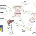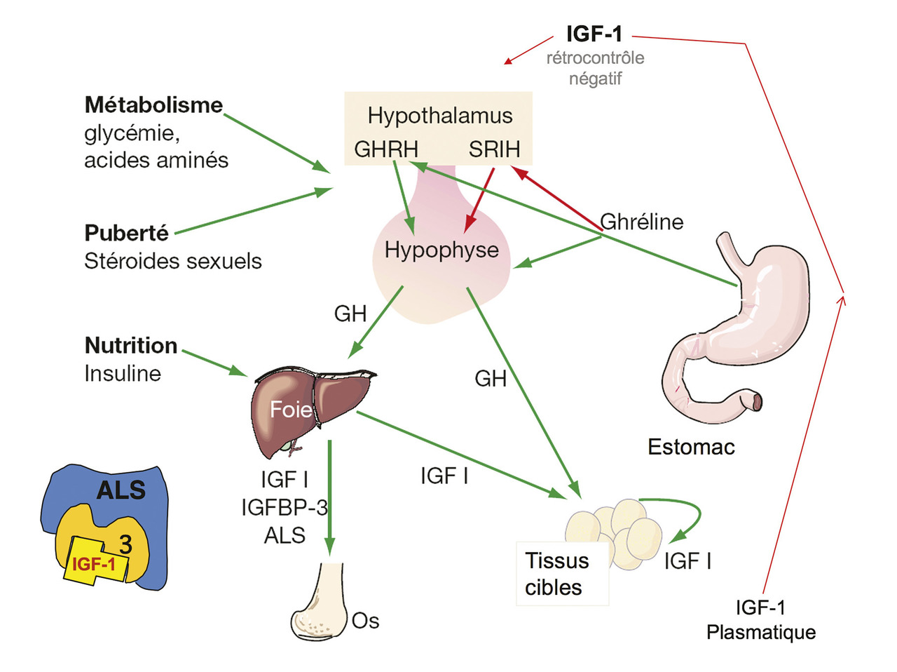 La croissance staturale durant la petite enfance est relativement régulière, d’environ 5 à 6 cm par an, alors que lors de la puberté elle est d’environ 20 à 30 cm. Cette croissance est sous la dépendance de facteurs hormonaux de l’axe somatotrope : growth hormone-releasing hormone (GH-RH) hypothalamique, hormone de croissance (GH) hypophysaire, insulin-like growth factor-1 (IGF-1) produite par le foie sous la dépendance de l’hormone de croissance (v. figure ). L’hormone de croissance est également stimulée par une hormone stomacale, la ghréline. La somatostatine hypothalamique (SRIH) a, en revanche, une action inhibitrice sur l’hormone de croissance. Cet axe est également sous la dépendance d’une alimentation adéquate (calories, protides, insuline, éléments minéraux, dont le calcium). Lors de la puberté, le pic de croissance est dû aux effets conjugués des stéroïdes sexuels (testostérone, estradiol) et de l’augmentation de l’IGF-1 elle-même due à l’augmentation de la concentration plasmatique de l’hormone de croissance sous la stimulation des stéroïdes sexuels. Ainsi, lors de la puberté, l’impact de ces derniers associés à l’IGF-1 sur le cartilage des os longs permet cette augmentation de la vélocité de croissance par la prolifération et la différentiation des cellules chondrocytaires jusqu’à leur minéralisation, qui induit l’arrêt de croissance. De plus, l’effet conjugué de ces hormones permet d’obtenir le statut maximum de densité osseuse des différents os de l’organisme.3