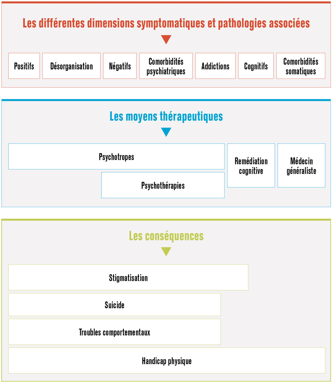 Les schizophrénies possèdent des caractéristiques qui ont des implications dans l’élaboration de stratégies optimisées (figure ) :