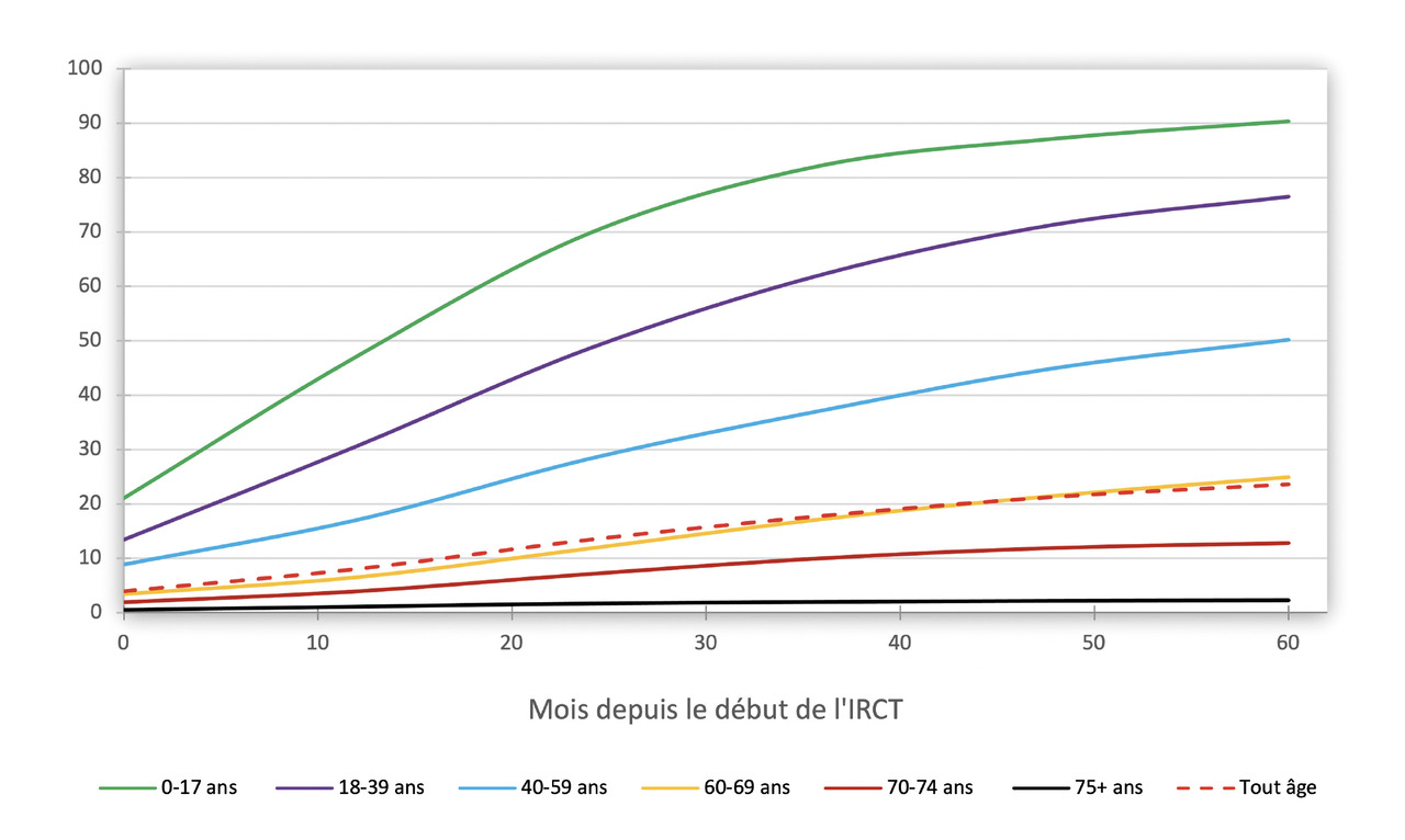 La survie du greffon rénal, prenant en compte les décès à 5 ans, est de 59,6 % entre 70 et 74 ans versus 47,3 % après 75 ans. Par comparaison elle est de 83,6 % entre 18 et 60 ans.2