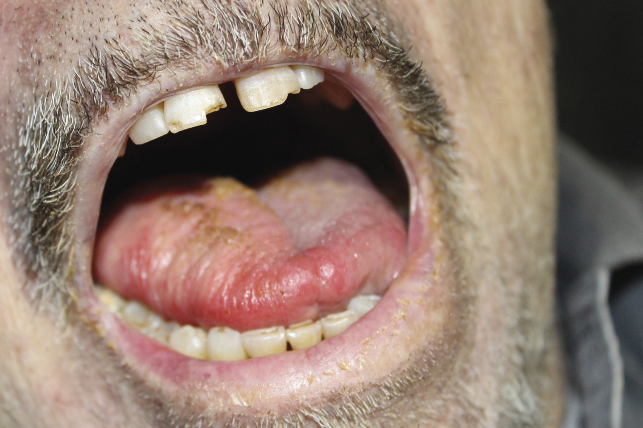 Gérard, 67 ans, est actuellement traité par radiothérapie pour un carcinome épidermoïde des cordes vocales. Depuis une semaine, il a des difficultés à avaler et des douleurs au niveau de la bouche. L’examen montre des placards fibrineux sur la langue et une sécheresse buccale.