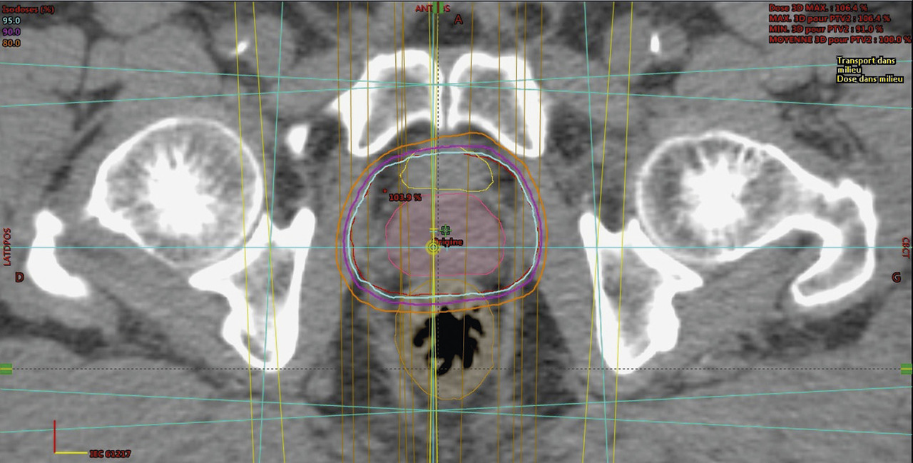 L’objectif de la radiothérapie est d’irradier un volume-cible (ici la prostate avec ou sans les vésicules séminales et les aires ganglionnaires) en préservant les organes à risque (OAR : rectum, vessie).