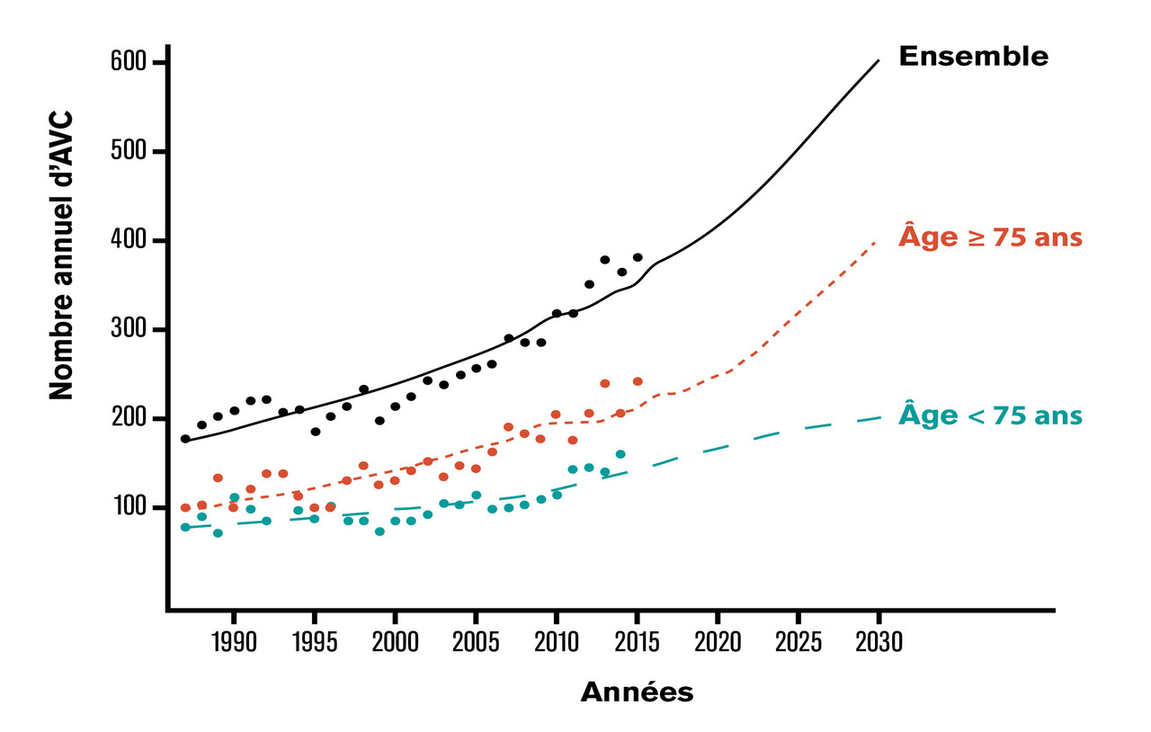 Les taux d’incidence et d’attaque des AVC doublent à chaque décade après 50 ans, chez l’homme comme chez la femme (fig. 1). Du fait de l’augmentation du nombre de personnes âgées, le nombre absolu de patients victimes d’un AVC chaque année a augmenté de 58 % entre les périodes 1987-1994 et 2009-2015 au sein du Registre dijonnais des AVC, en dépit d’une incidence standardisée stable.3 L’augmentation était même de 65 % chez les sujets de plus de 75 ans. Ces mêmes tendances ont été observées à l’échelle internationale également. Les projections démographiques font état d’une augmentation à venir de 55 % du nombre annuel de cas d’AVC d’ici à 2030 à Dijon (+ 65 % chez les plus de 75 ans) [fig. 2],3 supérieure à l’augmentation attendue de 34 % en Europe d’ici à 2035. Le profil des patients pris en charge dans les USINV s’est ainsi modifié au cours du temps, avec des sujets de plus en plus âgés (actuellement la moitié des patients ayant un AVC ont plus de 80 ans) et plus fragiles que par le passé. Le Registre dijonnais des AVC montre ainsi que seuls 44 % des patients âgés de plus de 80 ans étaient totalement indépendants avant leur AVC, 12 % avaient un handicap moteur léger, 26 % un handicap modéré, et 17 % un handicap sévère. De plus, la prévalence des troubles cognitifs légers était de 13,8 % et celle de démence de 13,7 % préalablement à l’AVC.