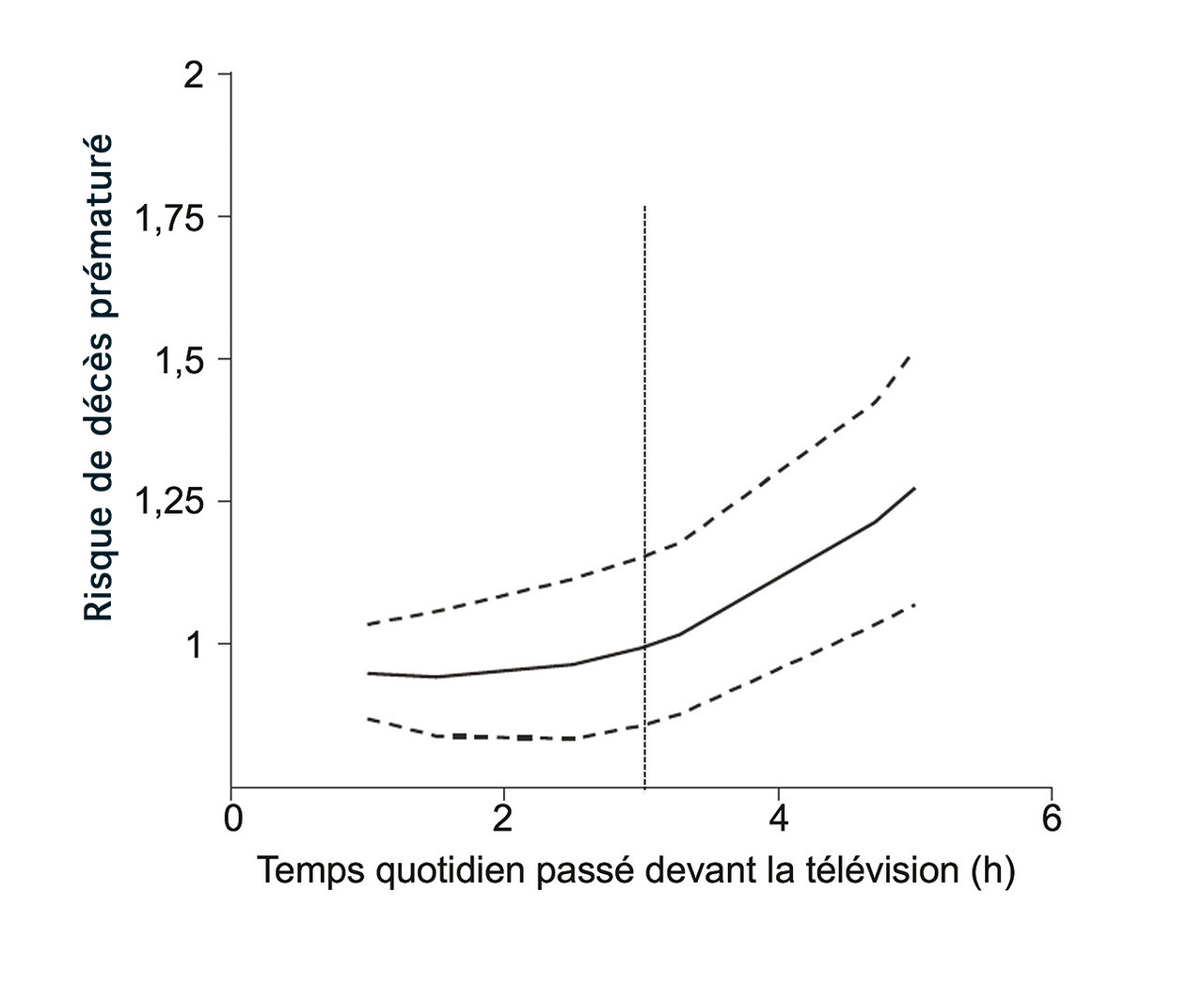 Même si l’on ne dispose que de peu de données épidémiologiques de comportement, on sait maintenant que la sédentarité per se joue un rôle important dans la mortalité globale et/ou l’incidence de pathologies chroniques. On estime entre 5 et 12 % l’augmentation du risque de décès prématuré pour chaque heure passée en position assise, au-delà de 7 heures par jour (fig. 2 ).10 Regarder la télévision est probablement la forme la plus répandue de sédentarité, surtout pendant les loisirs. Le risque de mortalité prématurée augmente nettement au-delà de 3 heures par jour passées devant le petit écran ; cette relation est retrouvée après ajustement par la qualité des apports alimentaires, la consommation d’alcool, l’indice de masse corporelle, l’apport énergétique, etc. L’ajustement par l’activité physique ne change pas la forme de la relation, suggérant ainsi que les effets négatifs du temps passé devant la télévision ne sont pas expliqués par un faible niveau d’activité physique (fig. 3 ).11