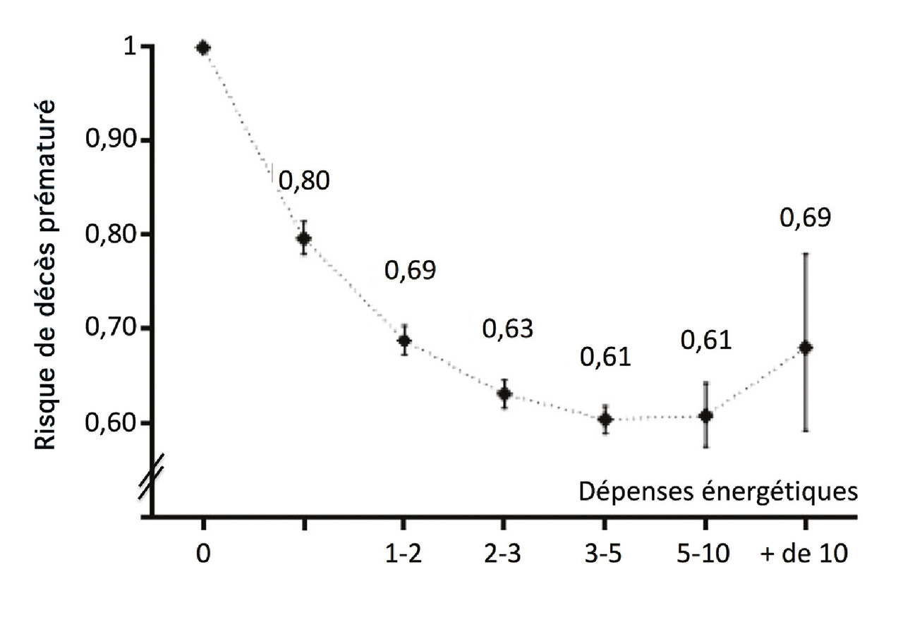 Toutes les méta-analyses les plus récentes concluent à une relation inverse entre la pratique d’activités physiques modérées à intenses et la mortalité générale (toutes causes confondues). L’activité physique correspondant aux recommandations réduit de 11 % le risque de décès prématuré chez les pratiquants de la marche et de 10 % chez les adeptes du vélo.5 Il existe une relation positive entre le niveau d’activité quotidien et la réduction de la mortalité toutes causes confondues, avec une réduction du risque de décès prématuré qui peut atteindre 39 % chez les personnes qui pratiquent 3 à 8 fois le minimum recommandé (