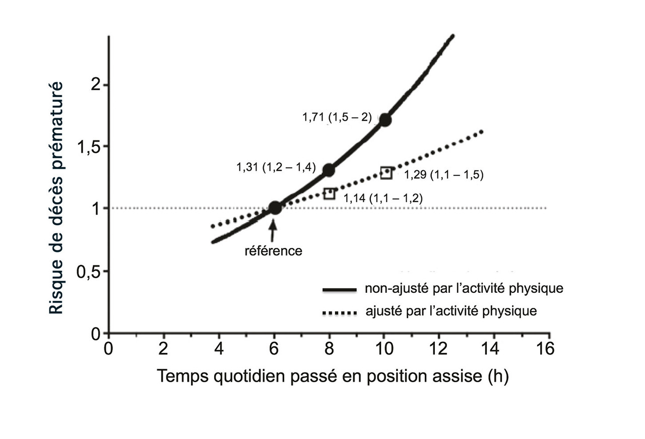 Chaque augmentation de 2 heures par jour du temps total passé en position assise augmente de 8 % le risque de cancer du côlon, de 10 % le risque de cancer de l’endomètre, et de 6 % le risque de cancer du poumon.8 L’incidence des pathologies cardiovasculaires (cardiomyopathies, coronaropathies, etc.), augmente de 15 % par tranche de 2 heures par jour passées devant la télévision.11 Le comportement sédentaire est maintenant considéré comme un facteur de risque important de survenue d’insulinorésistance et de diabète de type 2 ; après ajustement par différents facteurs confondants (sexe, âge, tabagisme, consommation d’alcool, réduction de mobilité, indice de masse corporelle, périodes d’activité physique intense, etc.), on estime que chaque heure passée en position assise au-delà de 7 heures par jour augmente de 22 % le risque de diabète de type 2, et de 39 % celui de syndrome métabolique.12