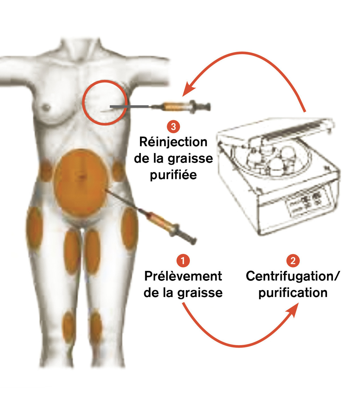 C’est une intervention chirurgicale réalisée au bloc opératoire, sous anesthésie générale, et plusieurs séances peuvent être nécessaires. Le prélèvement de tissu graisseux est effectué de façon atraumatique par de petites incisions à l’aide d’une canule d’aspiration. Il peut être réalisé de façon manuelle ou à l’aide d’appareils qui aspirent et recueillent la graisse. Cette dernière est ensuite purifiée soit par centrifugation, soit par lavage et décantation, avant d’être transférée à l’aide de microcanules par de toutes petites incisions.
