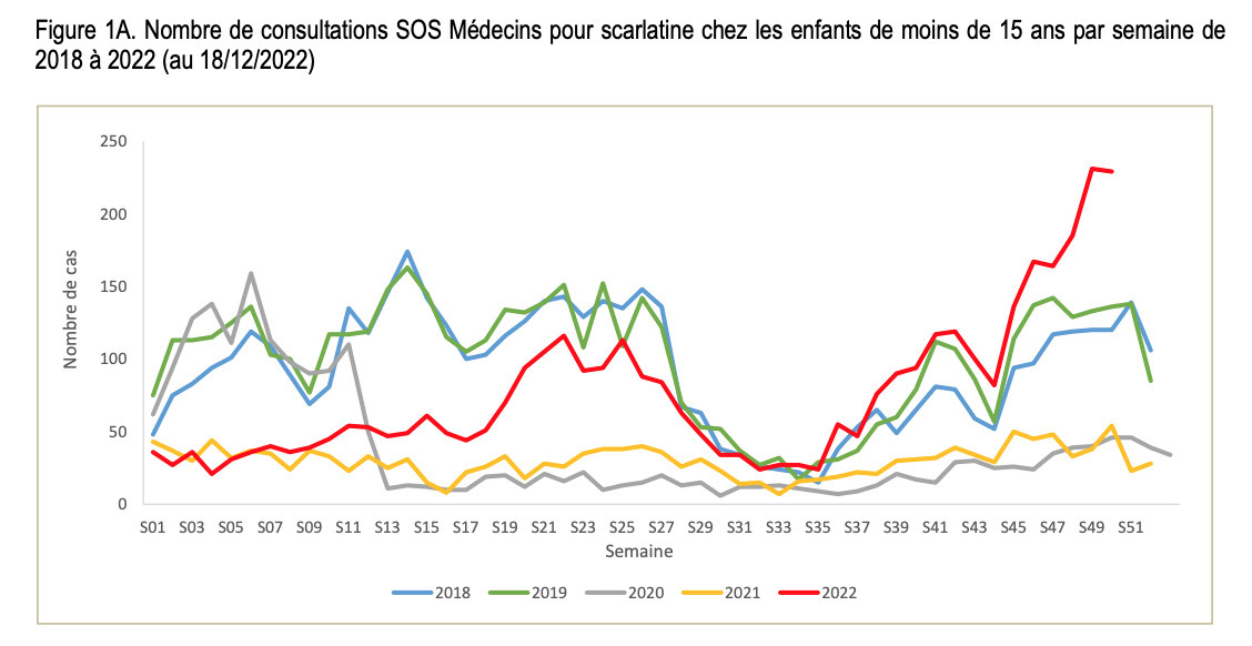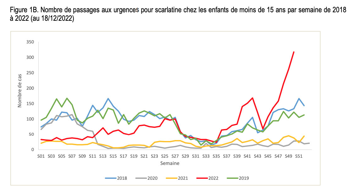 Ce bilan a donc révélé, outre l’augmentation des IISGA en France en 2022 (très marquée depuis le mois de novembre et jusqu'en semaine 49 chez les enfants, avec des niveaux dépassant ceux de 2019), une hausse des infections non invasives à streptocoque du groupe A, notamment les scarlatines depuis le mois de septembre 2022 (dont les niveaux observés sont proches de ceux enregistrés avant la pandémie de Covid). Pendant les deux années 2020 et 2021, la fréquence des infections à SGA avait été particulièrement faible, probablement en lien avec les mesures barrières.