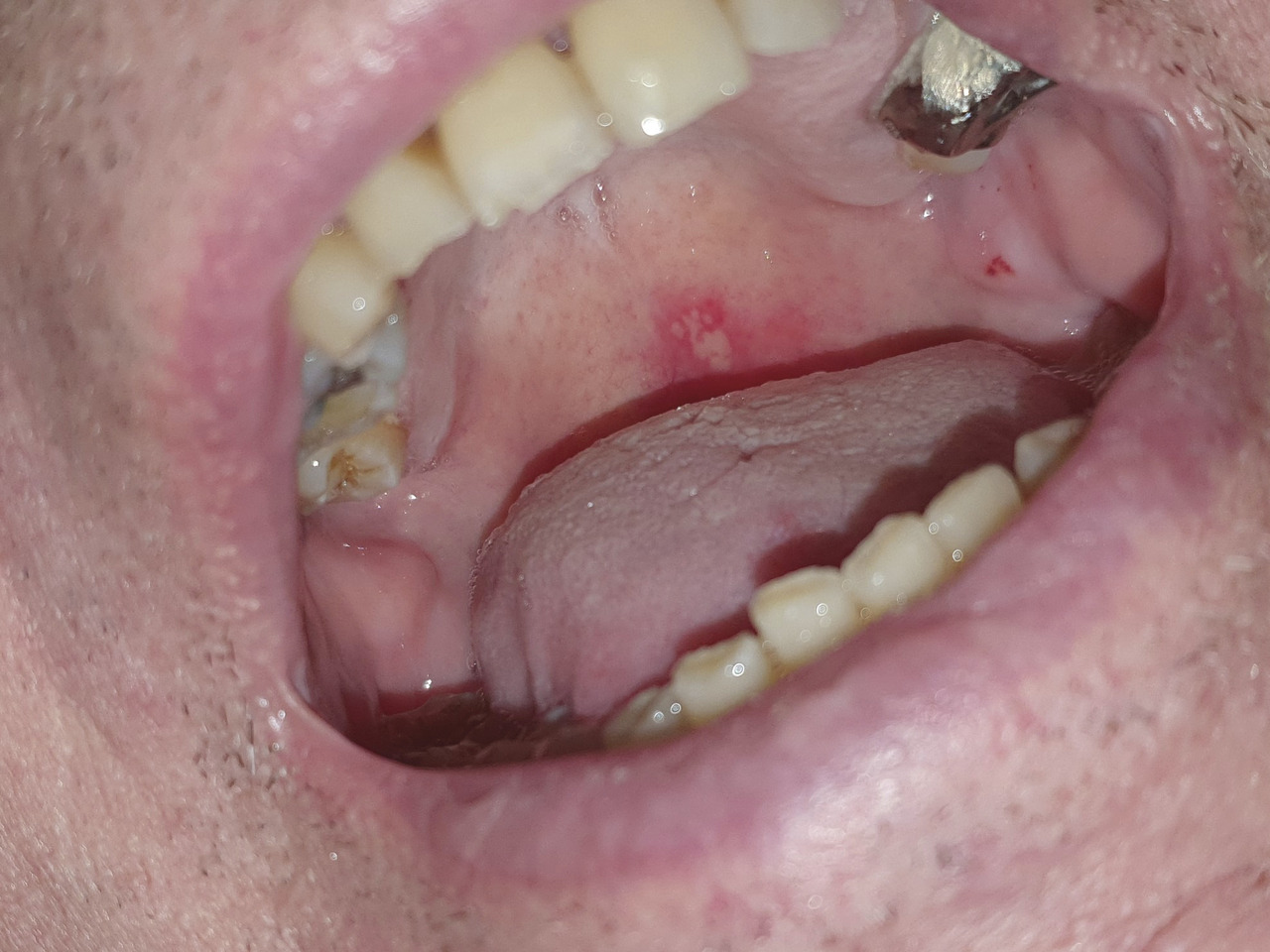 Sylvain, 53 ans, consulte pour douleurs oropharyngées importantes, apparues cinq jours plus tôt, après un traitement par corticoïdes pour une angine virale prescrit par un confrère. Il a très fréquemment, depuis son adolescence, des « boutons de fièvre » et des douleurs buccales. L’examen clinique met en évidence un bouquet de vésicules au niveau du palais (photo ).