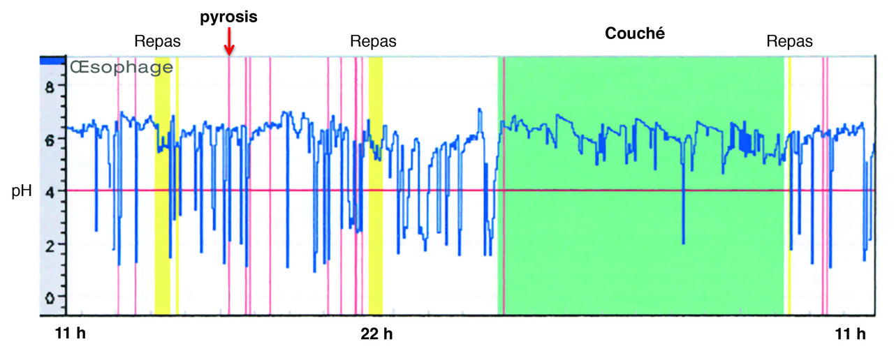 Si le reflux pathologique n’a jamais été documenté, une pH-métrie de 24 heures est recommandée, à réaliser après une semaine de sevrage : elle recherche une exposition acide œsophagienne pathologique (temps passé à pH < 4 supérieur à 5 %). Système sans fils, la capsule Bravo est posée au décours de l’endoscopie et laissée en place 48-96 heures, d’où une meilleure rentabilité diagnostique par rapport à la pH-métrie classique. Si cet examen est normal et s’il n’y a pas d’association temporelle entre les symptômes et les reflux enregistrés, l’hypothèse d’un RGO pathologique est écartée. Chez un patient ayant des brûlures rétrosternales ascendantes qui ne correspondent pas à la survenue d’un reflux, on parle de « pyrosis fonctionnel ». Une association temporelle symptômes/reflux malgré une pH-métrie normale fait le diagnostic d’œsophage acido-sensible ou d’hypersensibilité au reflux (