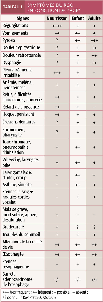 Son caractère agressif est attesté par d’autres symptômes (tableau 1 ). Ils peuvent être « œsophagiens » : difficulté à boire, anorexie, refus de s’alimenter, irritabilité, mauvaise croissance pondérale, pyrosis, douleur abdominale ; mais aussi « extra-œsophagiens » : toux, broncho-pneumopathie chronique, laryngite, asthme, érosions dentaires, malaise.2 Enfin, un reflux physiologique qui se prolonge au-delà de 16 mois est considéré comme pathologique.1