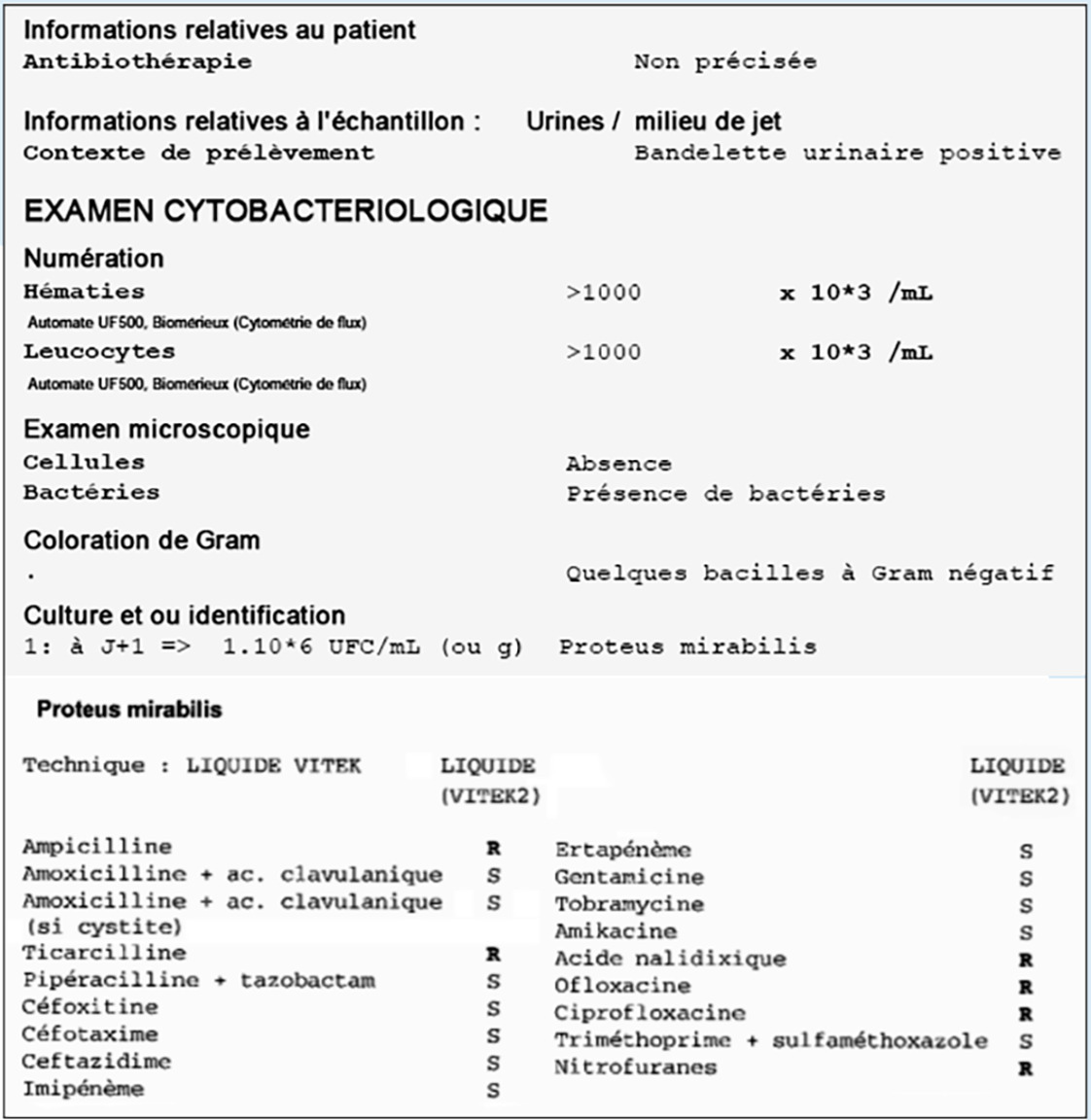 L’ECBU (figure ) confirme une infection à Proteus mirabilis résistant aux fluoroquinolones.