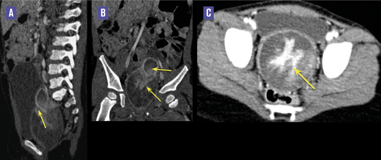 Cette enfant de 2 ans, en bon état général, était adressée pour une masse prolabée à travers l’hymen évoluant depuis 4 mois. L’examen urogénital montrait une masse extériorisée perforé sans envahissement local visible. Un scanner abdomino-pelvien (v. figure ) révélait de volumineuses masses tissulaires hétérogènes confluentes, de contours irréguliers, comblant la lumière vaginale trop dilatée, s’étendant à travers le col utérin vers la lumière utérine qui était comblée et responsable d’un aspect aminci du myomètre. Aucune localisation secondaire à distance n’était notée. Une vaginoscopie montrait plusieurs formations polyploïdes. Une exérèse de 12 formations était alors réalisée. L’étude histologique était en faveur d’un rhabdomyosarcome botryoïde classé risque standard type C devant l’âge de la patiente, la taille, le site favorable, l’absence d’adénopathies et le type botryoïde (embryonnaire). L’enfant est actuellement sous chimiothérapie.