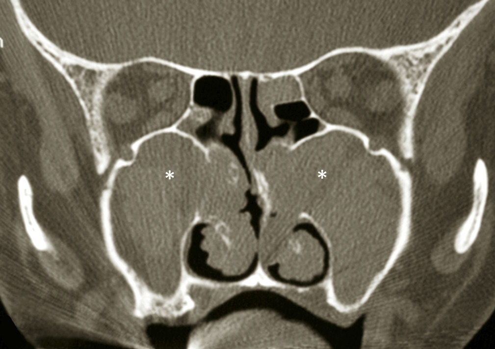 Le bilan clinique est complété par une tomodensitométrie qui montre des opacités sinusiennes plus ou moins diffuses. Une des particularités des patients suivis pour mucoviscidose est d’avoir des variations de pneumatisation des sinus (en particulier une hypoplasie des sinus frontaux) ou des distensions muqueuses des sinus maxillaires