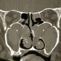 Le bilan clinique est complété par une tomodensitométrie qui montre des opacités sinusiennes plus ou moins diffuses. Une des particularités des patients suivis pour mucoviscidose est d’avoir des variations de pneumatisation des sinus (en particulier une hypoplasie des sinus frontaux) ou des distensions muqueuses des sinus maxillaires(fig. 2) avec refoulement médian des cornets inférieurs.4 En cas de céphalées persistantes, des complications à type de poches muqueuses ethmoïdo-frontales appelées mucocèles doivent être recherchées.