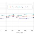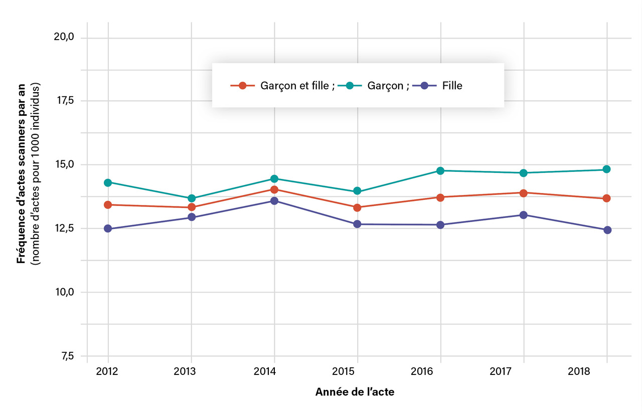 Sur la période étudiée, la fréquence annuelle d’actes scanner était relativement constante (tous âges et sexes confondus) et fluctuait autour de 13,7 actes pour 1 000 enfants (