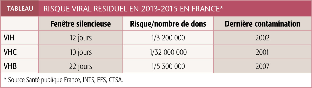 La sélection clinique des candidats au don de sang, les dépistages sérologiques et/ou génomiques d’agents infectieux dans chaque PSL et les méthodes d’atténuation des pathogènes ont rendu le risque de contamination extrêmement faible (tableau), notamment par les virus « majeurs », hépatites B et C, VIH dont les sérologies en pré- et post-transfusionnel ne sont, de ce fait, plus recommandées.