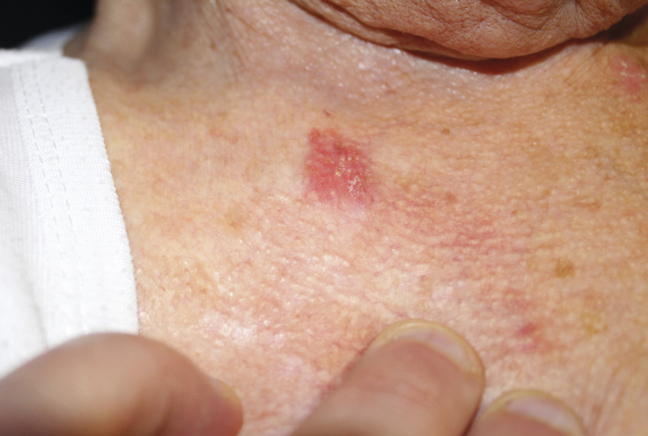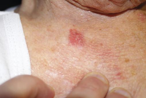 Robert, 87 ans, consulte pour une lésion érythémateuse apparue à la base du cou il y a 2 mois, qui s’agrandit progressivement malgré l’application de dermocorticoïdes. L’examen montre une macule rose avec des squames au centre. Une exérèse totale est réalisée.