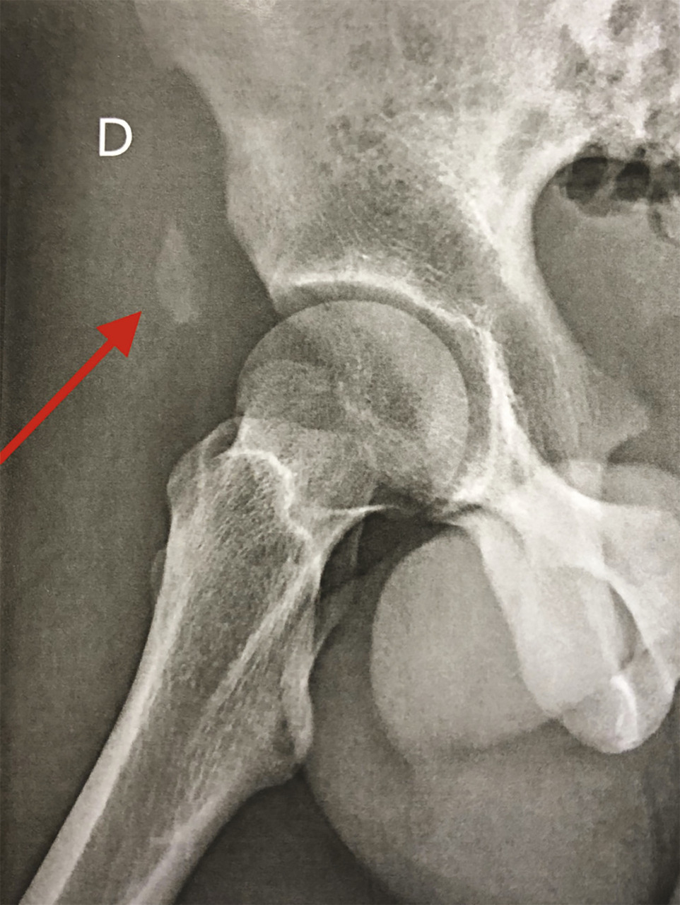 Ce jeune homme de 16 ans se présentait aux urgences pour une douleur brutale à la face antérieure de cuisse droite apparue lors d’un mouvement de tir au football. La palpation notait une voussure proximale douloureuse. La radiographie montrait une avulsion osseuse proximale de l’épine iliaque antéro-inférieure déplacée de 2,5 cm (v. figure ). Ce déplacement justifiait la réinsertion chirurgicale de cette avulsion osseuse du droit antérieur. Le patient avait totalement récupéré à 3 mois.
