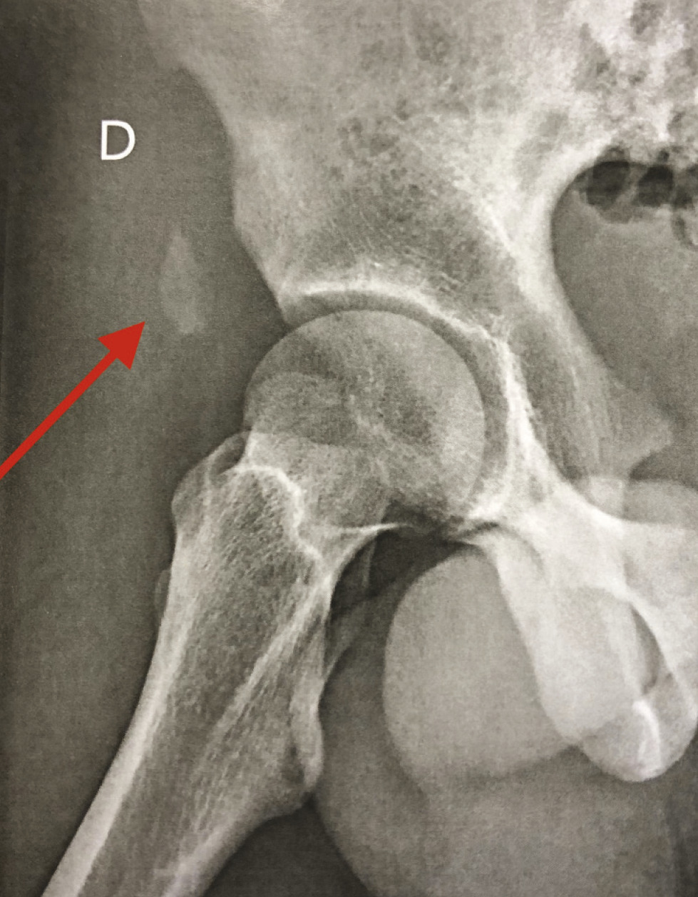 de cuisse droite apparue lors d’un mouvement de tir au football. La palpation notait une voussure proximale douloureuse. La radiographie montrait une avulsion osseuse proximale de l’épine iliaque