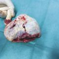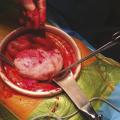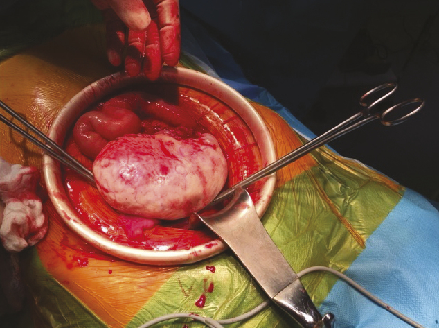 Cette jeune fille de 16 ans était admise aux urgences pour une hémorragie interne, en état de choc. Elle avait reçu un coup de sabot de cheval dans le bas ventre. La tomodensitométrie abdomino-pelvienne montrait un épanchement intra-abdominal abondant et une masse hétérogène au niveau du pelvis avec une extravasation de produit de contraste en faveur d’un saignement actif et évoquant une contusion mésentérico-intestinale (fig. 1 ). L’état hémodynamique de la patiente s’étant déstabilisé, une laparotomie était décidée ; l’application de deux pinces de Bengoléa sur les vaisseaux rompus (fig. 2 et 3 ) permettait de contrôler l’hémorragie. Devant une modification architecturale manifeste de l’ovaire, une annexectomie non conservatrice était réalisée. Les suites opératoires étaient normales. L’anatomopathologie était en faveur d’une tumeur stromale bénigne. Une déclaration systématique dans le réseau national des tumeurs rares de l’ovaire de l’Institut national du cancer était faite.