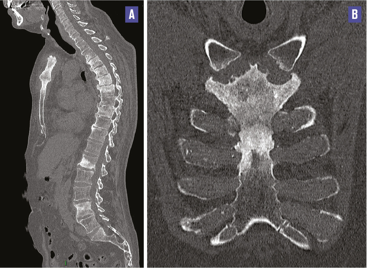 Cet homme de 64 ans, sans antécédent notable, consultait pour des douleurs rachidiennes et chondrocostales de rythme inflammatoire évoluant depuis 2012, sans manifestations digestives, ophtalmologiques ou cutanées. Il n’avait ni douleurs abdominales, ni fièvre, ni amaigrissement récent. L’examen clinique notait un syndrome rachidien, l’absence de souffle cardiaque ou d’anomalies cutanées. La tomodensitométrie thoraco-abdominopelvienne (v. figure ) montrait des lésions ostéocondensantes au niveau du rachis et du sternum avec des ossifications ligamentaires antérieures et des érosions des plateaux vertébraux, ainsi qu’une ankylose manubrio-sternale, évoquant un syndrome SAPHO. Un traitement par bisphosphonates était prescrit (et le patient perdu de vue).