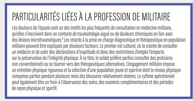 Un militaire de 35 ans consulte pour des scapulalgies droites d’allures neurologique et mécanique, évoluant depuis un an. Il identifie comme facteur déclenchant une manipulation ostéopathique du rachis thoracique. Il aurait ressenti une vive décharge électrique depuis le point d’appui du praticien jusqu’au pouce, selon un trajet nerveux C6. Il présente deux antécédents de luxation gléno-humérale antérieure droite, sans instabilité séquellaire.
