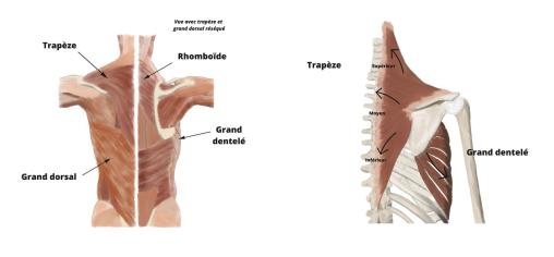Les structures entourant la scapula doivent également être évaluées, à la recherche de douleur, d’une perte de fonction ou d’une instabilité : rachis thoracique, articulation acromio-claviculaire, muscles de la coiffe des rotateurs, les deux chefs du biceps, l’articulation gléno-humérale et notamment le labrum.La scapula alata est un type de dyskinésie scapulaire qualifiée de dynamique (SAD) lorsque le décollement varie avec les mouvements du membre supérieur. Elle est due à un déficit des muscles stabilisateurs de la scapula : dentelé antérieur, trapèze, rhomboïdes et élévateur de la scapula (fig. 3 ). Ce déficit est généralement secondaire à une atteinte du nerf responsable de la commande motrice de ces muscles : le nerf accessoire pour le trapèze, le nerf thoracique long pour le dentelé antérieur et le nerf scapulaire dorsal pour les rhomboïdes. Cette atteinte peut être d’origine traumatique, inflammatoire ou idiopathique. Le diagnostic est à évoquer devant un déficit de fixation de la scapula sur le thorax et une scapulalgie.