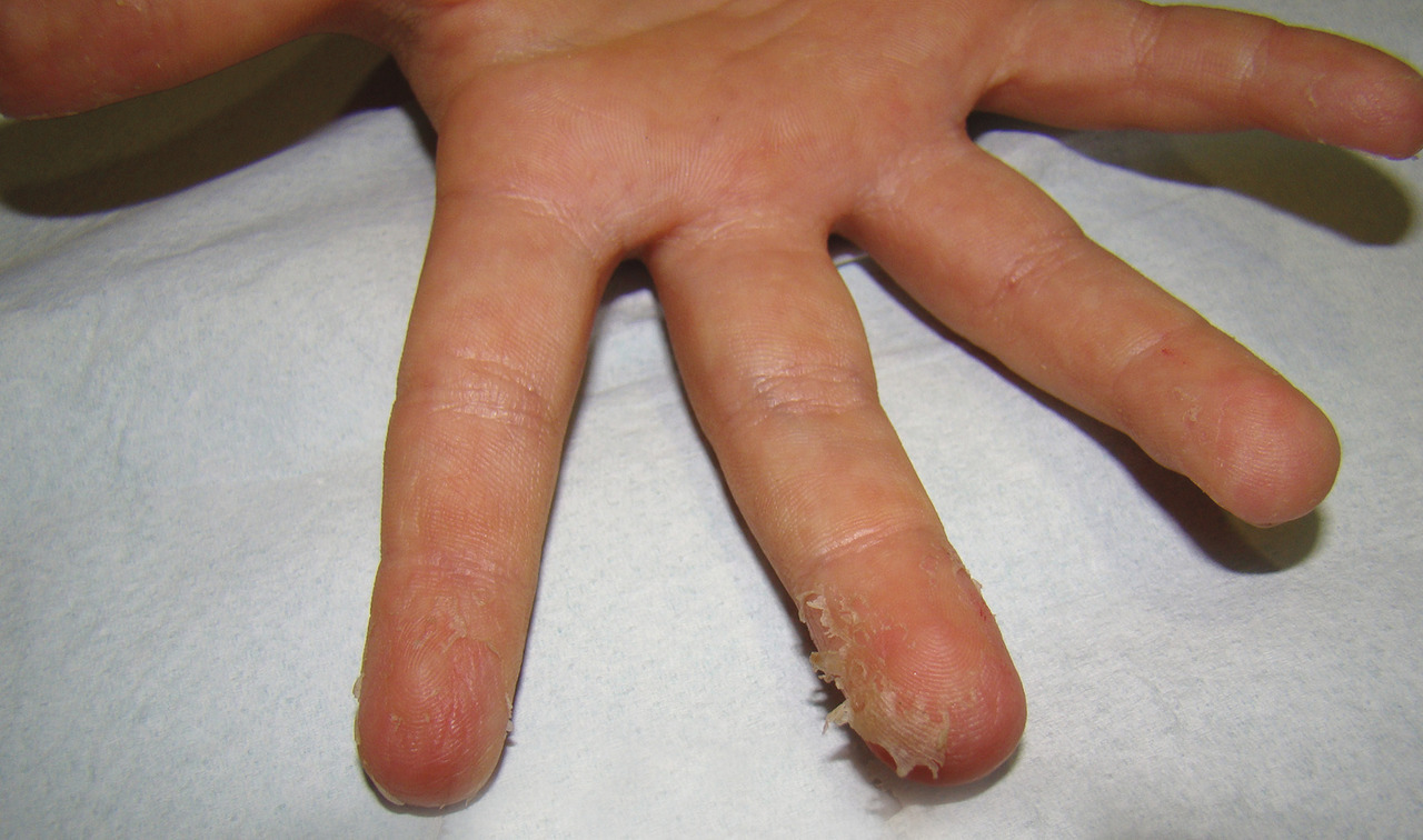 Damien, 4 ans, a une desquamation des mains prédominant au niveau des extrémités. Il a eu, une semaine auparavant, lors de vacances en Espagne, un exanthème maculeux recouvrant la quasi-totalité du corps, accompagné d’hyperthermie (39 °C), langue dépapillée, douleur pharyngée. Suspectant une angine, le médecin lui a prescrit de l’amoxicilline.