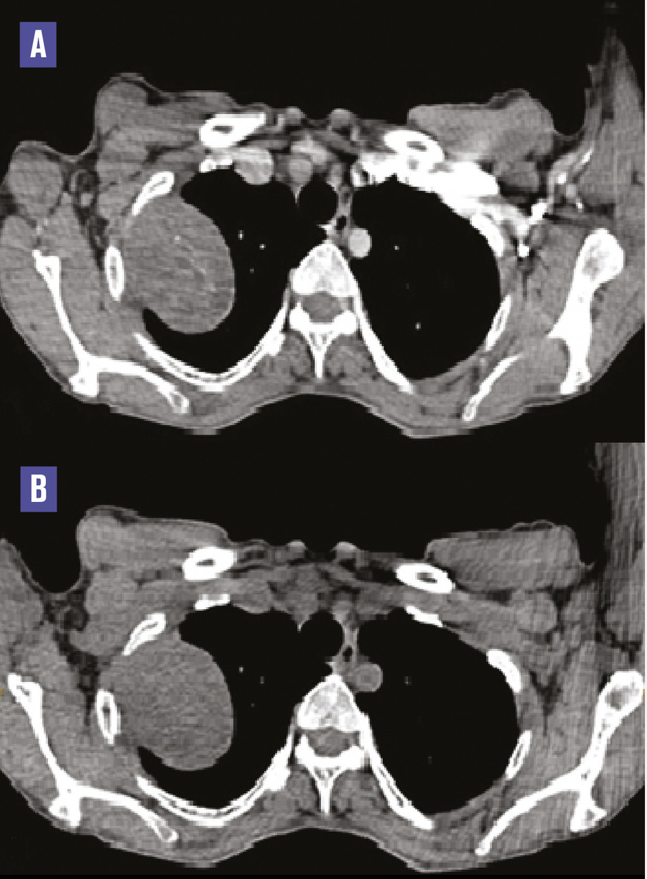 Cette femme de 44 ans était admise aux urgences pour une douleur thoracique aiguë et une dyspnée. La radiographie thoracique montrait une volumineuse opacité du tiers supérieur du poumon droit. La tomodensitométrie (TDM) sans et avec contraste (fig. 1 ) notait une masse bien limitée, de 60 x 46 x 45 mm, tissulaire homogène, faiblement réhaussée, avec une interface nette avec le poumon et un angle avec la 2e côte. L’origine pleurale était évoquée. Une biopsie scannoguidée permettait une analyse histologique en faveur d’un schwannome pleural bénin. En raison de l’aggravation de la dyspnée, une ablation chirurgicale était réalisée : la masse d’implantation pleurale respectait le parenchyme pulmonaire (fig. 2 ).