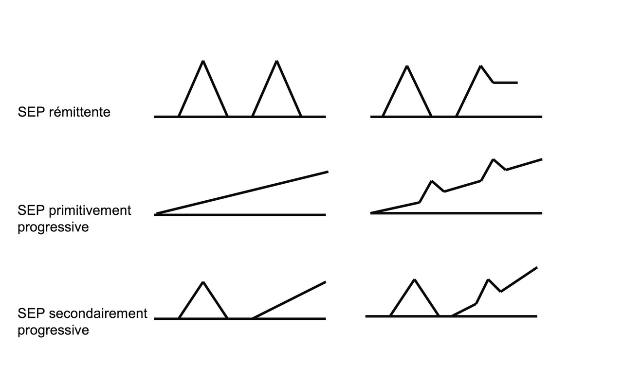 Ces formes touchent autant les hommes que les femmes, débutent à un âge plus avancé (en moyenne 40 ans), avec un handicap qui survient plus vite. Les formes d’emblée progressives sont habituellement caractérisées par une atteinte médullaire progressive (réduction du périmètre de marche, troubles vésico-sphinctériens). Ces formes peuvent être avec ou sans poussées surajoutées. La progression se définit cliniquement sur une évaluation au moins annuelle.Formes dites « bénignes »
