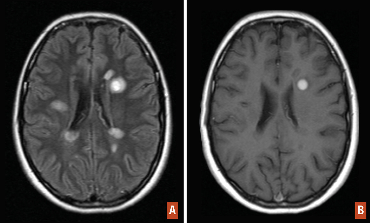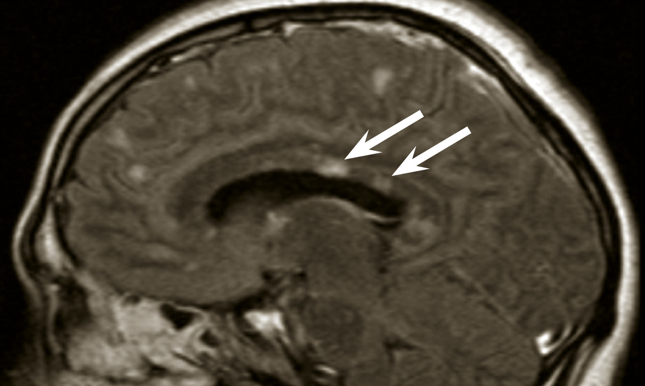 Une jeune femme bijoutière fait une névrite optique isolée avec séquelle à l’imagerie par résonance magnétique (IRM) encéphalique avec un seul hypersignal T2 FLAIR du corps calleux. Puis, deux ans après, un syndrome de Brown-Séquard TH5 gauche ; l’IRM répond aux critères de dissémination temporo-spatiale de McDonald.