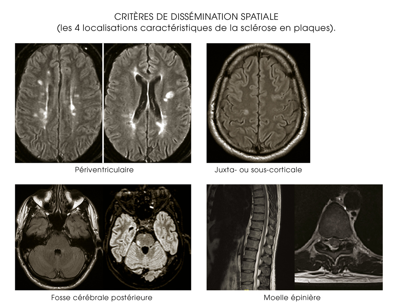 La dissémination spatiale des lésions est prouvée par la mise en évidence d’une atteinte de plusieurs zones du système nerveux central, soit à l’anamnèse ou à l’examen clinique, soit à l’IRM.