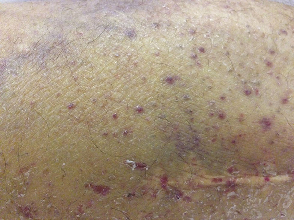 Cet homme de 57 ans, alcoolique chronique, était adressé pour une suspicion de thrombophlébite du membre inférieur droit. Il avait un œdème induré du mollet droit, indolore, jaune à violet, évoquant un hématome sous-cutané et un purpura périfolliculaire pétéchial à ecchymotique sur les membres inférieurs (fig. 1 et 2 ). Biologiquement, il avait une anémie à 10,5 g/dL, mixte avec un syndrome inflammatoire chronique (hypoalbuminémie 22,4 g/L, CRP : 70 mg/L), une carence ferriprive (fer sérique 3,7 µmol/L et CST 11 %, ferritine normale à 245 ng/mL) et des carences vitaminiques majeures (B9 à 2,4 ng/mL). Les D-dimères étaient élevées (1 860 ng/mL). Le patient était en mauvais état général, avec une amyotrophie généralisée, un déchaussement des dents quasi complet… Le diagnostic de scorbut était confirmé par le dosage de la vitamine C, qui était inférieur à 3 µmol/ L. Un doppler veineux des membres inférieurs éliminait la phlébite et montrait une infiltration hématique sous-cutanée diffuse. Après recharge en vitamine C à 1 g/j, le purpura des membres inférieurs disparaissait rapidement et l’état du patient s’améliorait.