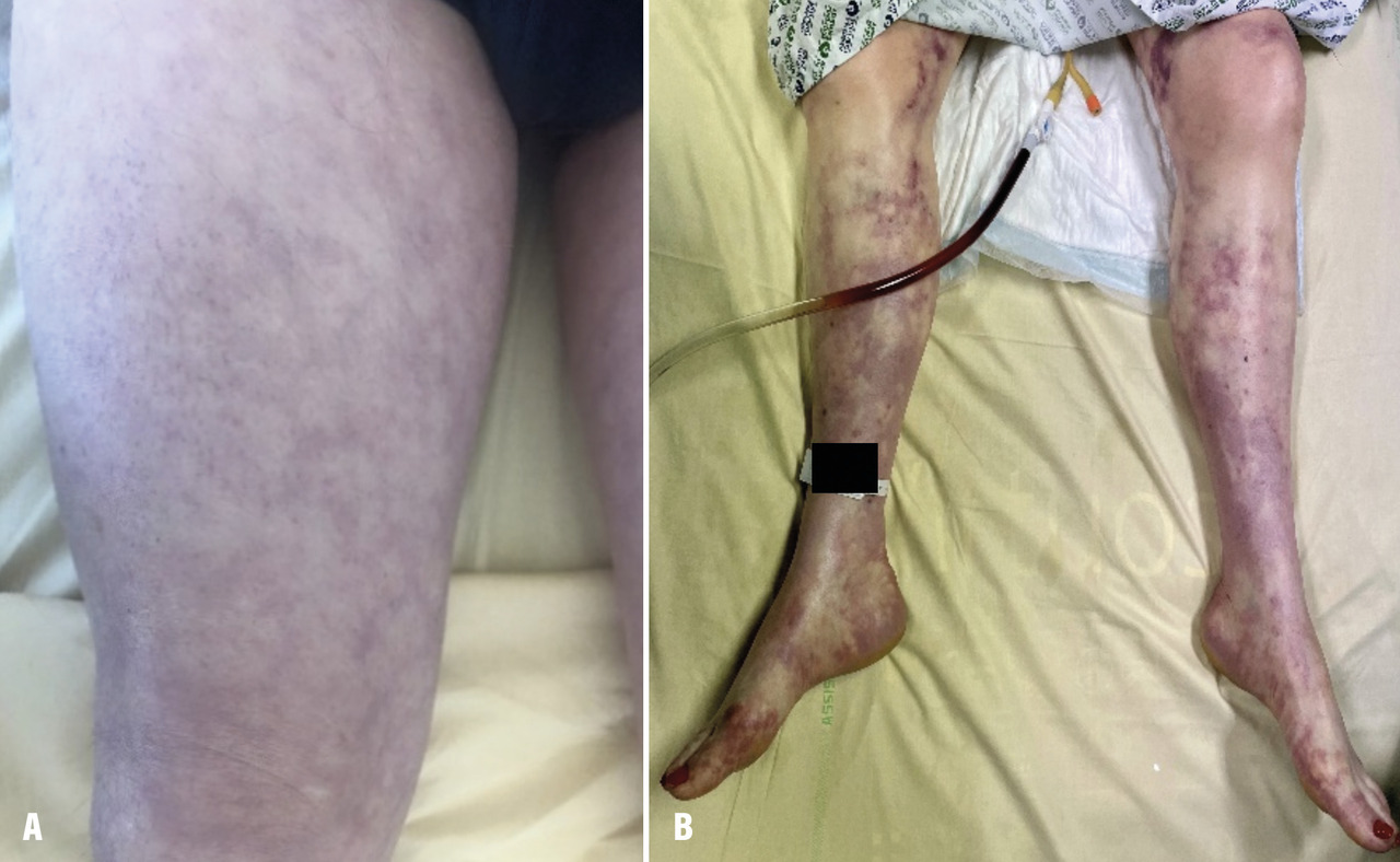 L’examen cutané peut également révéler des stigmates de CIVD, avec des manifestations soit thrombotiques traduisant la thrombose des petits vaisseaux (fig. B), soit hémorragiques avec des saignements diffus, en nappe (notamment aux points de ponction), témoignant de la consommation des éléments de la coagulation.