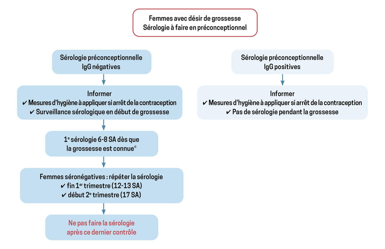 Devant des résultats encourageants, certaines équipes d’experts incitent à prescrire le dépistage et à traiter les femmes concernées. Ainsi, au même titre que la réalisation des sérologies rubéole et toxoplasmose avant la grossesse, ils conseillent de prescrire une sérologie CMV aux femmes ayant un désir de grossesse et de les informer des mesures d’hygiène à appliquer dès l’arrêt de la contraception (figure). En cas de sérologie positive (IgG positives), il est inutile de répéter la sérologie pendant la grossesse. Si elle négative, elle doit être refaite au cours du premier trimestre de grossesse pour identifier une éventuelle primo-infection (figure). Si celle-ci est avérée, un traitement par valaciclovir permettrait de diminuer à moins de 10 % le risque de transmission virale au fœtus.
