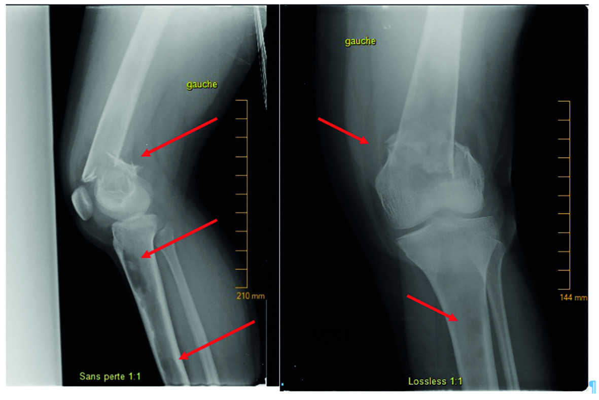 Les radios montrent une fracture fermée comminutive déplacée, supracondylienne, du fémur (fig. 1), dont la sévérité fait suspecter une pathologie sous-jacente. On note plusieurs lésions ovalaires hyperclaires et un amincissement de la corticale osseuse au niveau du tiers distal du fémur et du tibial proximal gauches (