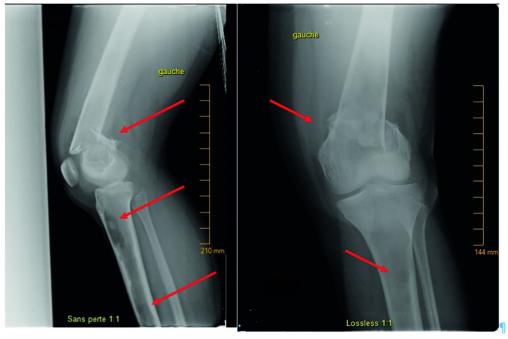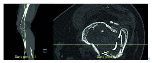 Les radios montrent une fracture fermée comminutive déplacée, supracondylienne, du fémur (fig. 1), dont la sévérité fait suspecter une pathologie sous-jacente. On note plusieurs lésions ovalaires hyperclaires et un amincissement de la corticale osseuse au niveau du tiers distal du fémur et du tibial proximal gauches (fig. 1 ; kystes lacunaires au scanner, fig. 2 ), mais aussi des lésions lacunaires bilatérales diaphysaires et métaphyso-diaphysaires.