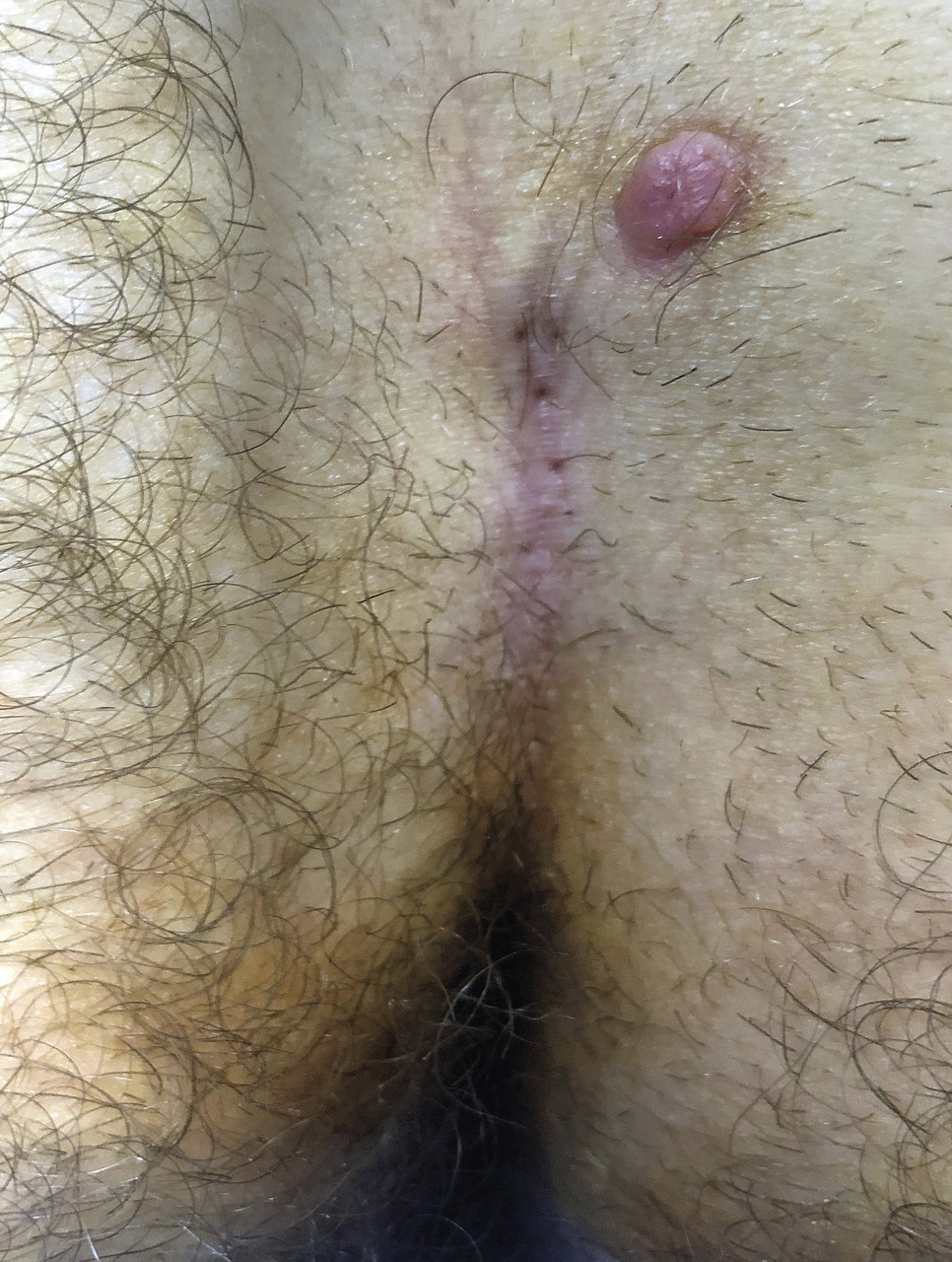 À l’examen, il a une tuméfaction inflammatoire du sillon interfessier, située au-dessus de fossettes avec des poils (